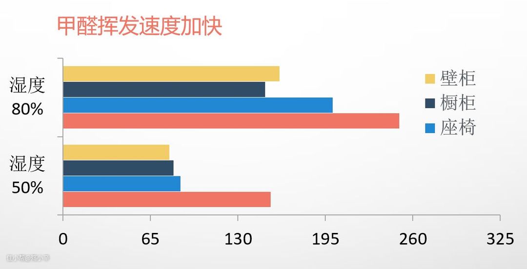 4、甲醛挥发速度加快,20℃ 室温条件下,相对湿度由 50% 提升到 80%,不同建材的甲醛释放速率将提升 1.6~2.3 倍。