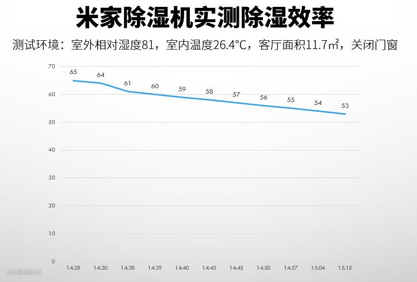 实测47分钟,室内湿度从65%降低到53%,降了12%,效果还是挺满意的