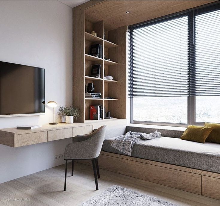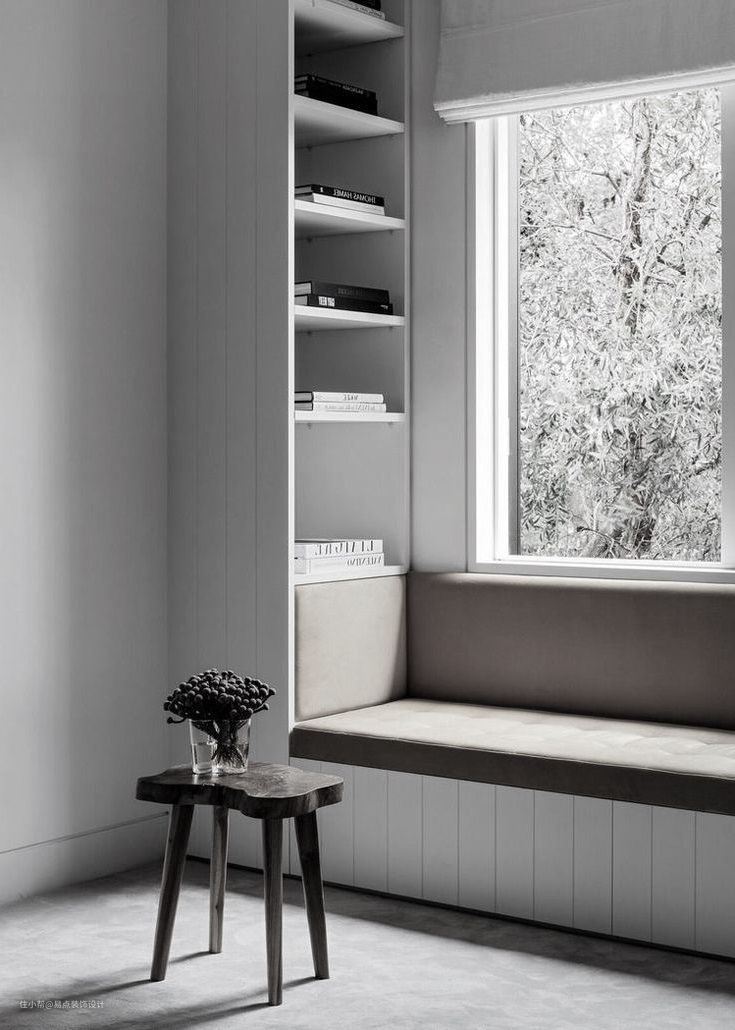 如果没有飘窗,完全可以自己创造一个飘窗出来,利用左右壁柜的做法,中间窗户下留着矮柜,与一般的飘窗高度相同就好,矮柜上做软垫。