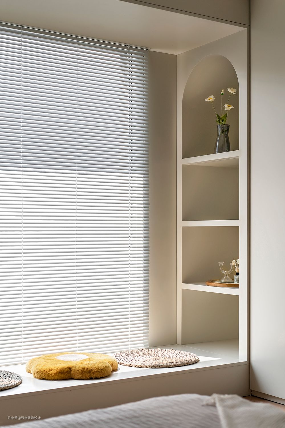 利用好飘窗上的墙角空间,做个拱形的开放壁柜,可以放置一些漂亮的摆设品,增加空间的储藏功能。
