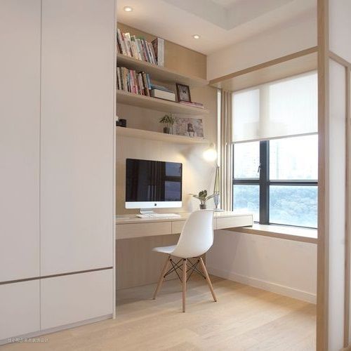 飘窗上的壁柜可连着写字台,整体性比较强,多功能区域打造,效果美美的。