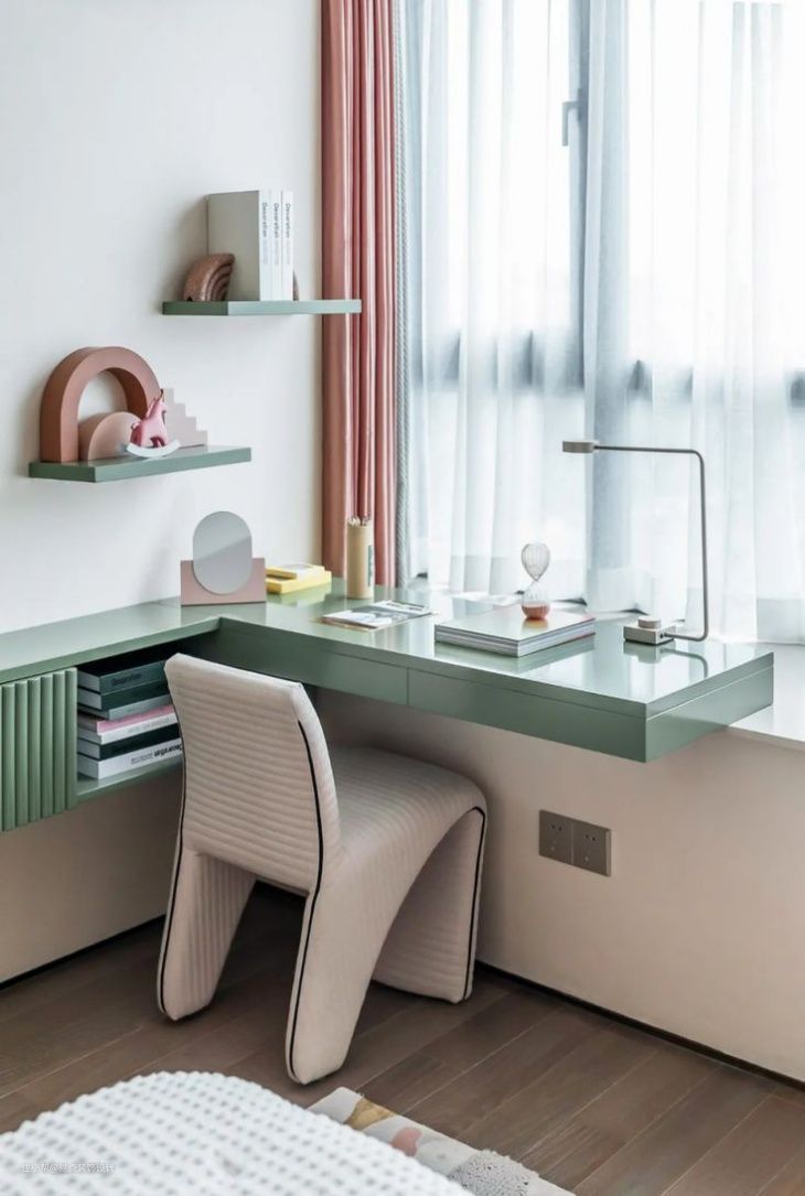 延伸的书桌台面可以架在飘窗上面,如果空间不够,想要桌面的长度更长,可以考虑这个做法。