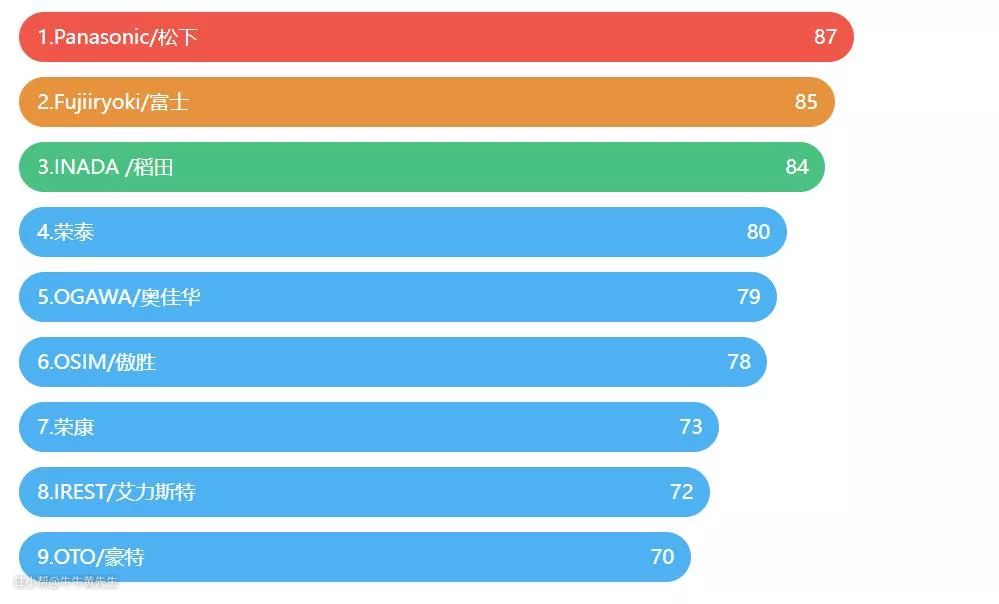 可以看到名列前三的品牌都是日系品牌:松下、富士、稻田。这是因为日本的按摩椅行业在世界上发展最久,技术更为成熟。但由于定价偏高,外形也比较古典,在国内市场受欢迎的程度远不及国产品牌
