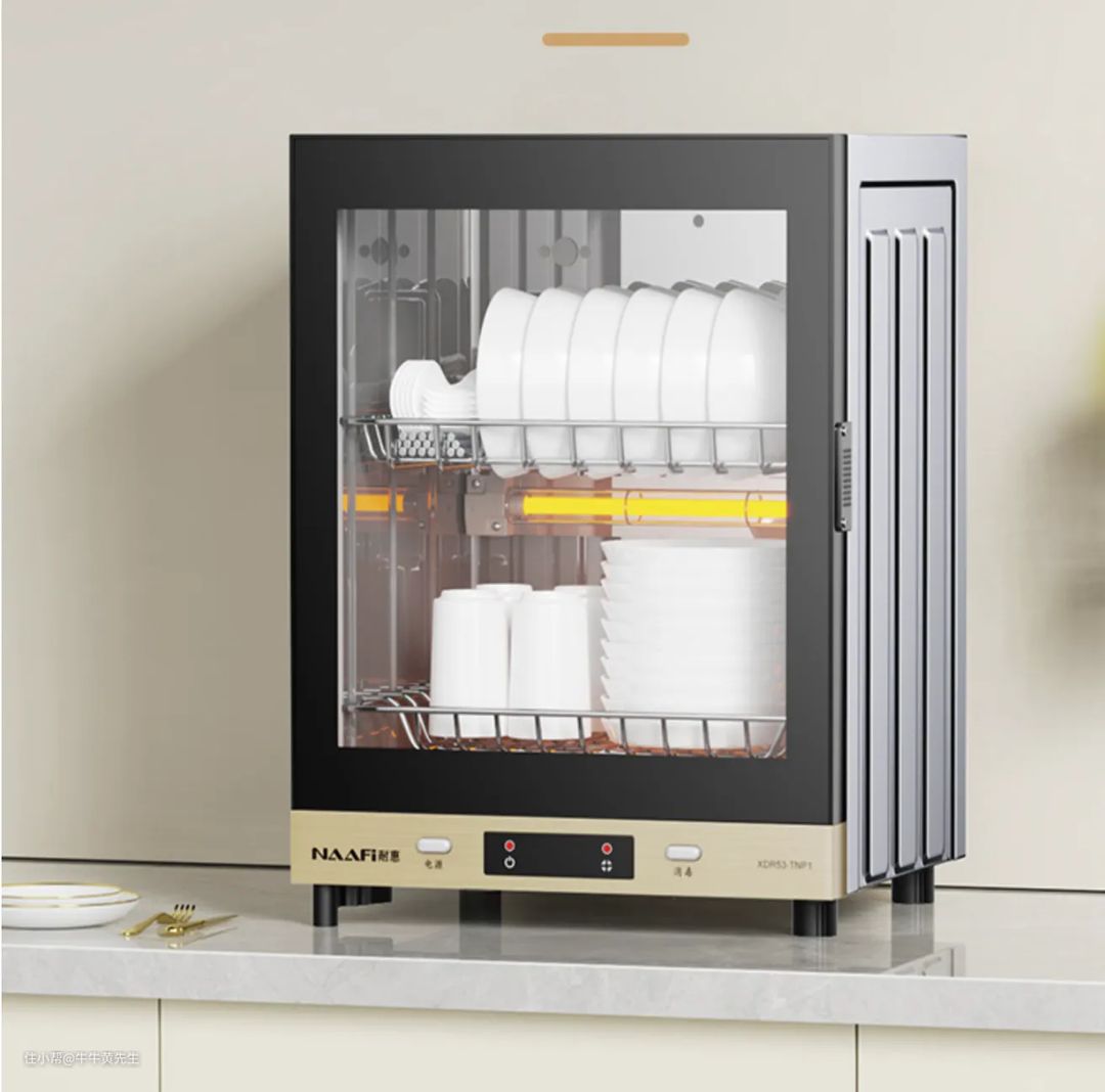再来说说消毒柜,消毒柜主要就是给餐具消毒,利用紫外线、红外线、高温和臭氧等不同方式来对餐具进行彻底的消毒。消毒柜通常比洗碗机便宜,还有储存功能,而且消毒柜专职消毒,是在清洁完成的基础上对餐具进行深层的清洁,如果说手工洗完是对餐具的初步整理,那么消毒柜则是对餐具的深度清洁。消毒柜不需要像洗碗机那样预留进水和排水口,只需要提前留好位置和插座就好。