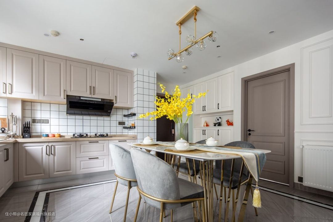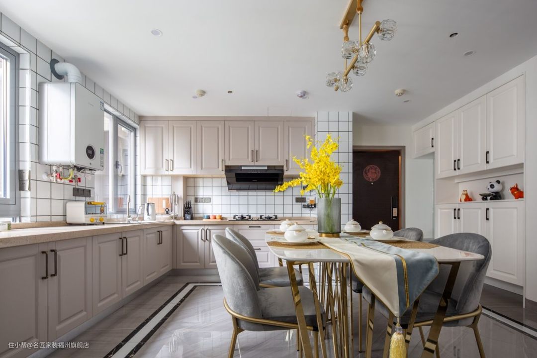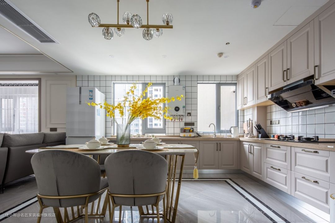 全屋最具设计感的地方,那便是客厅、餐厅、厨房的一体化设计,三者在同一空间之中不仅增加了互动的便利性,更是同时增加了三者的空间面积,住出大豪宅的感觉。入户进门,左边设计悬空橱柜和壁龛,即可放置小摆件又可收纳杂物。右边完全打通隔断墙体,打造开放式的厨房和餐厅。厨房操作台呈L型沿窗户设计,细长的操作台和开放式空间设计完全保证了下厨的活动空间充足,即便多人操作也没问题,同时大面积的窗户也可保证视线明亮,光线充足。#厨房#餐厅#橱柜#餐桌