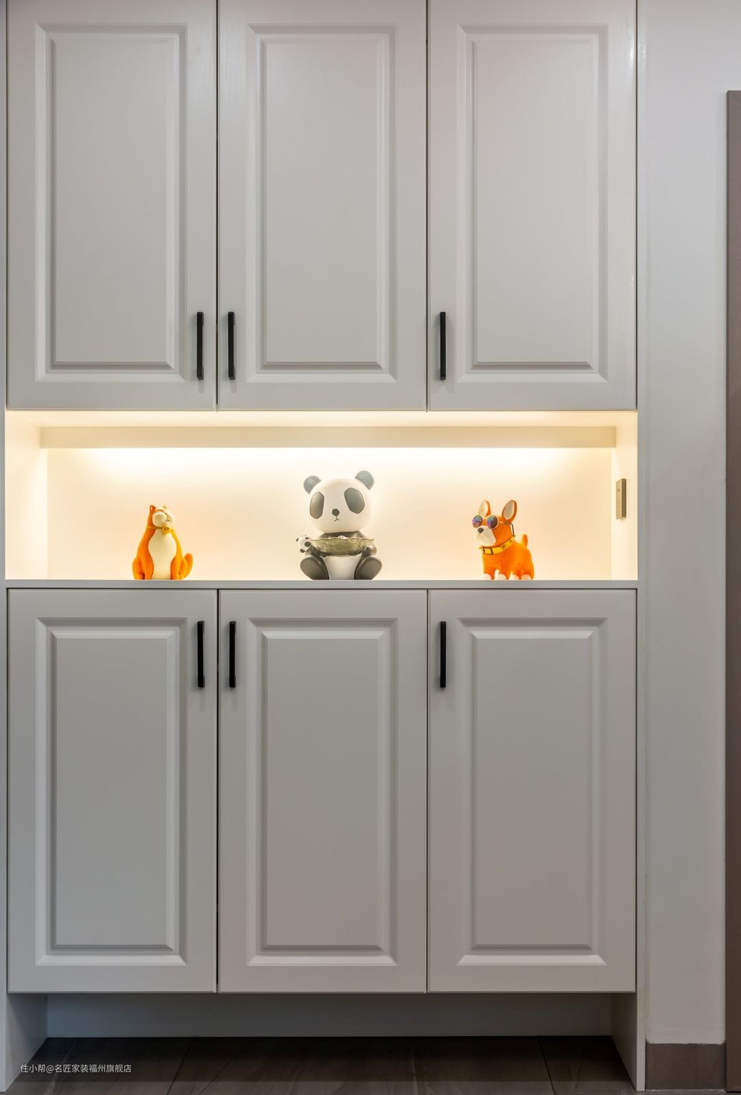 玄关处设计悬空白色简约橱柜搭配壁龛,上下均可放置杂物,悬空地面可放鞋,中间嵌入区设计隐藏灯带,放置一些可爱小摆件后充满浪漫情趣。#玄关#橱柜