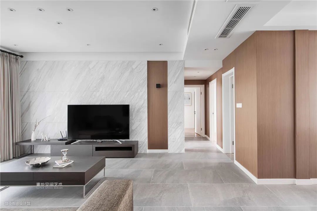 ▲过道天花做了吊顶,里面装着空调设备与风口,在电视墙加入木饰面的材质,也让客厅到餐厅之间的过渡更加和谐自然。