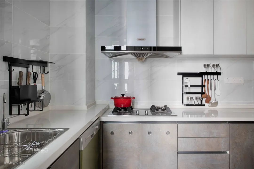 ▲厨房装上灰色的橱柜,L字形的操作台,灶台区与水槽区做了高低台的处理,墙面贴上雅白的墙砖,装上白色吊柜,墙面装上实用的收纳挂钩,为主人打造了一个实用方便的厨房烹饪空间。