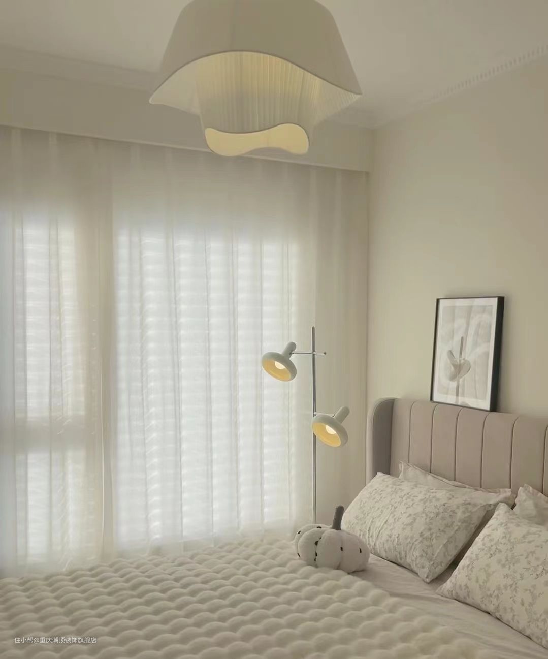 百叶窗搭配纱幔的组合可以说是比较新颖,在做到遮光保护隐私的同时也能很好改善卧室的采光问题#卧室#地板#奶油风#ins风