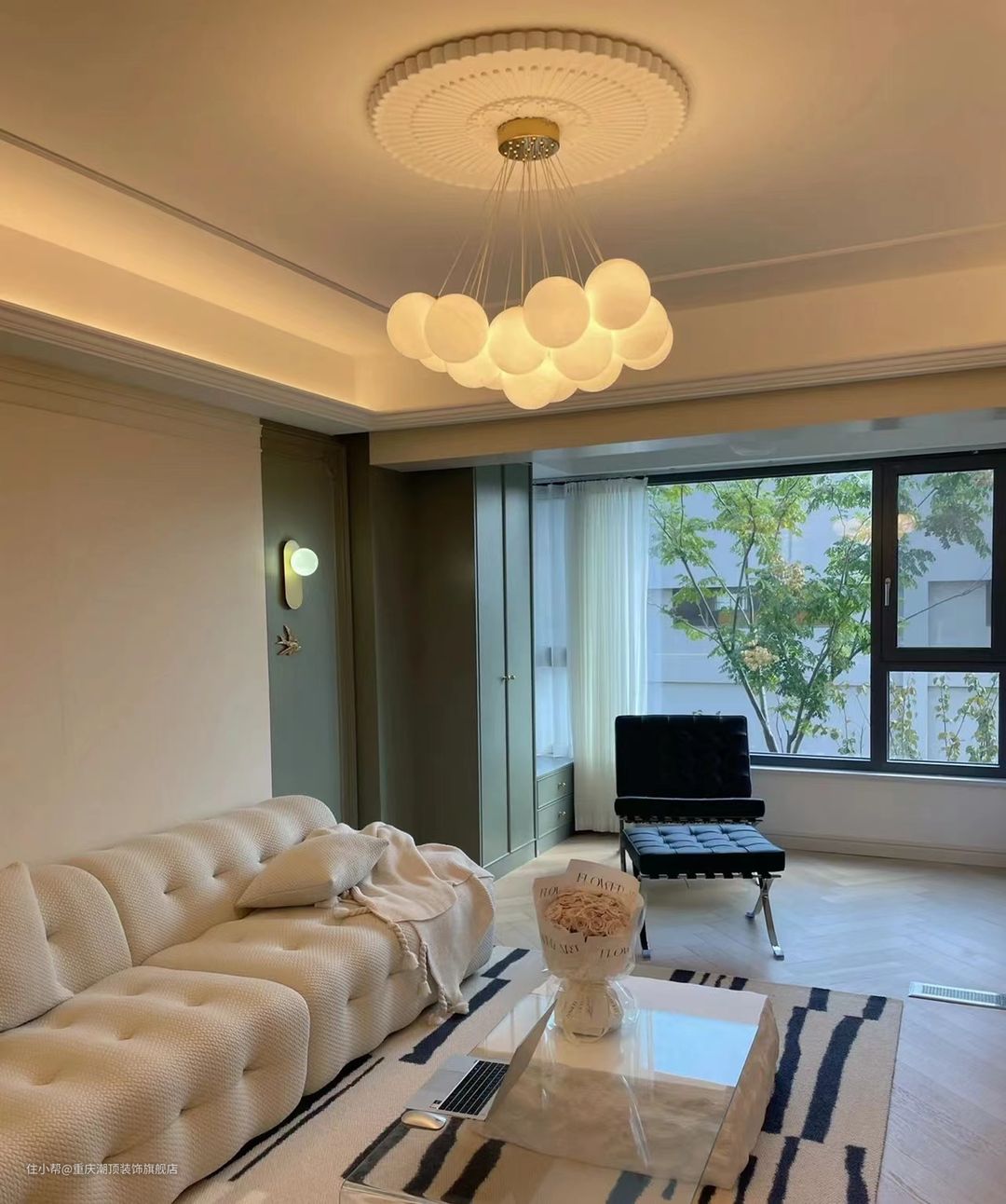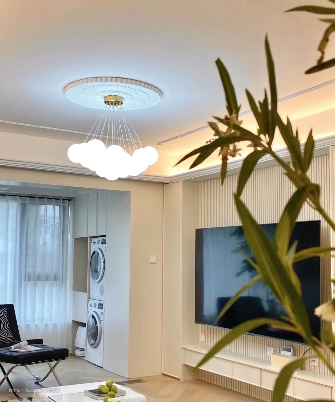 吊顶可选择白色球形吊灯或法式流苏吊灯,无论哪种都能给人温暖的艺术气息,高冷与暖柔交融。