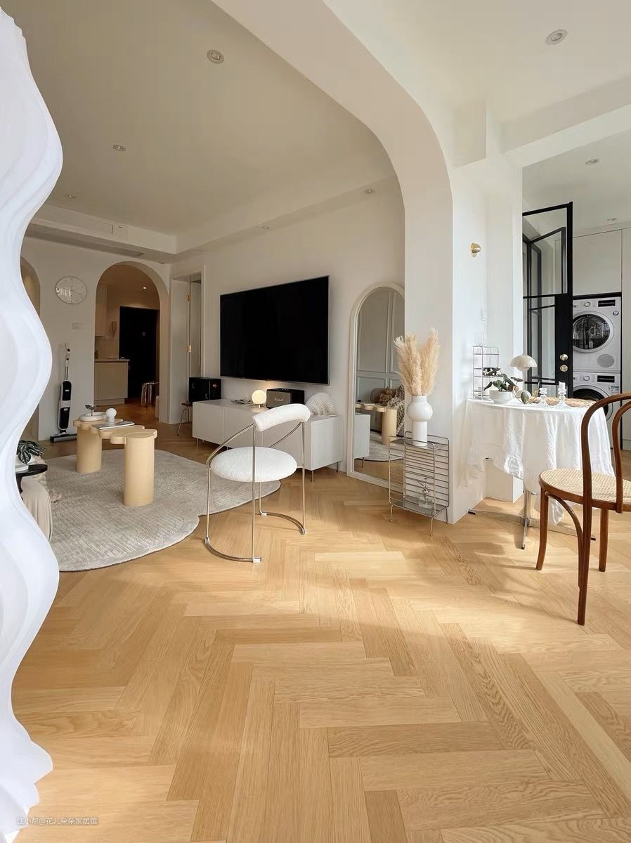 以实用功能实用为主,例如客厅的边顶,无主灯设计,石膏线背景墙,拱门弧形造型,人字拼地板等等,摒弃繁复的造型设计,既提高了空间利用率,同时也能凸显轻法式的浪漫柔美的空间氛围感。