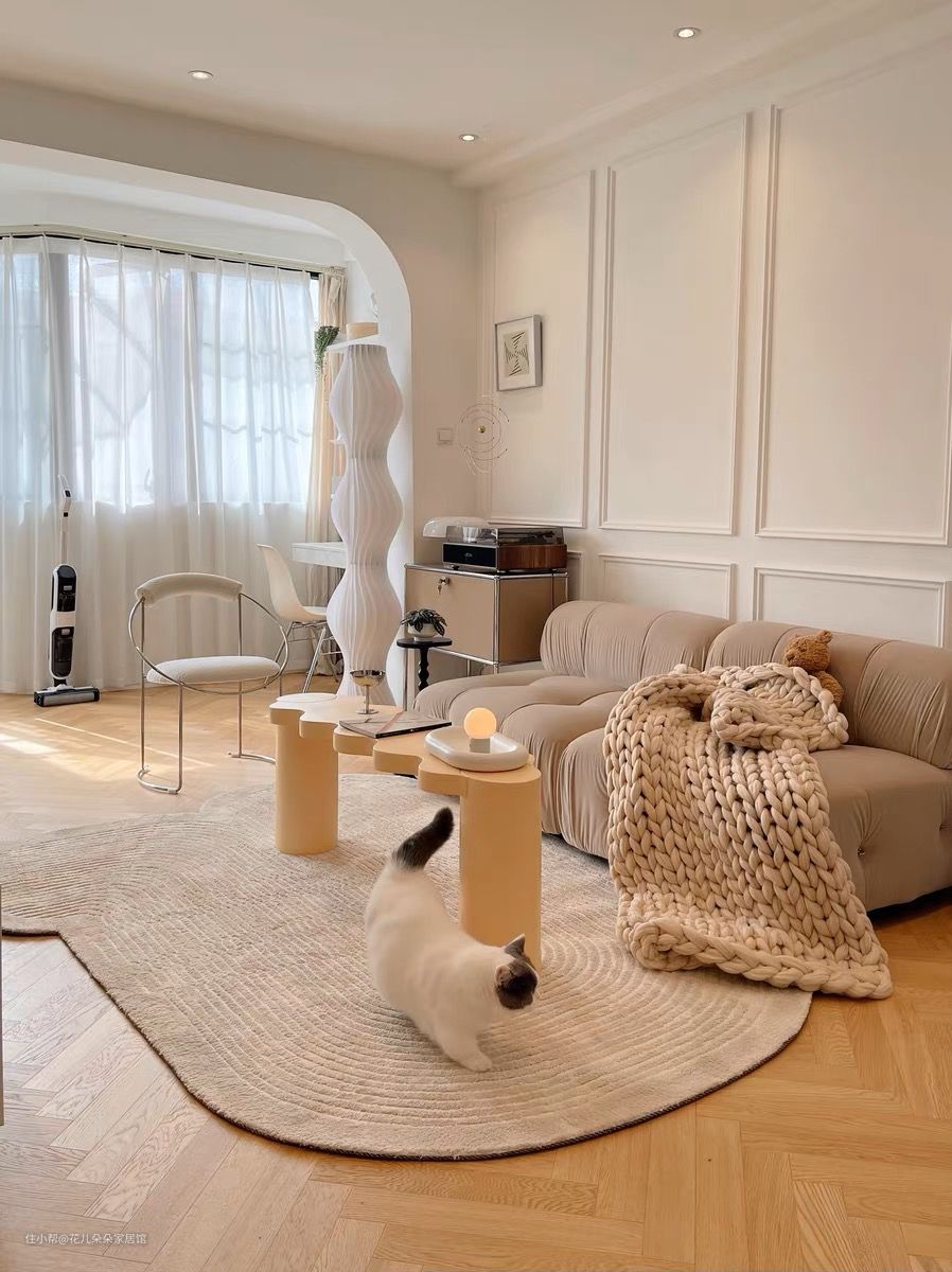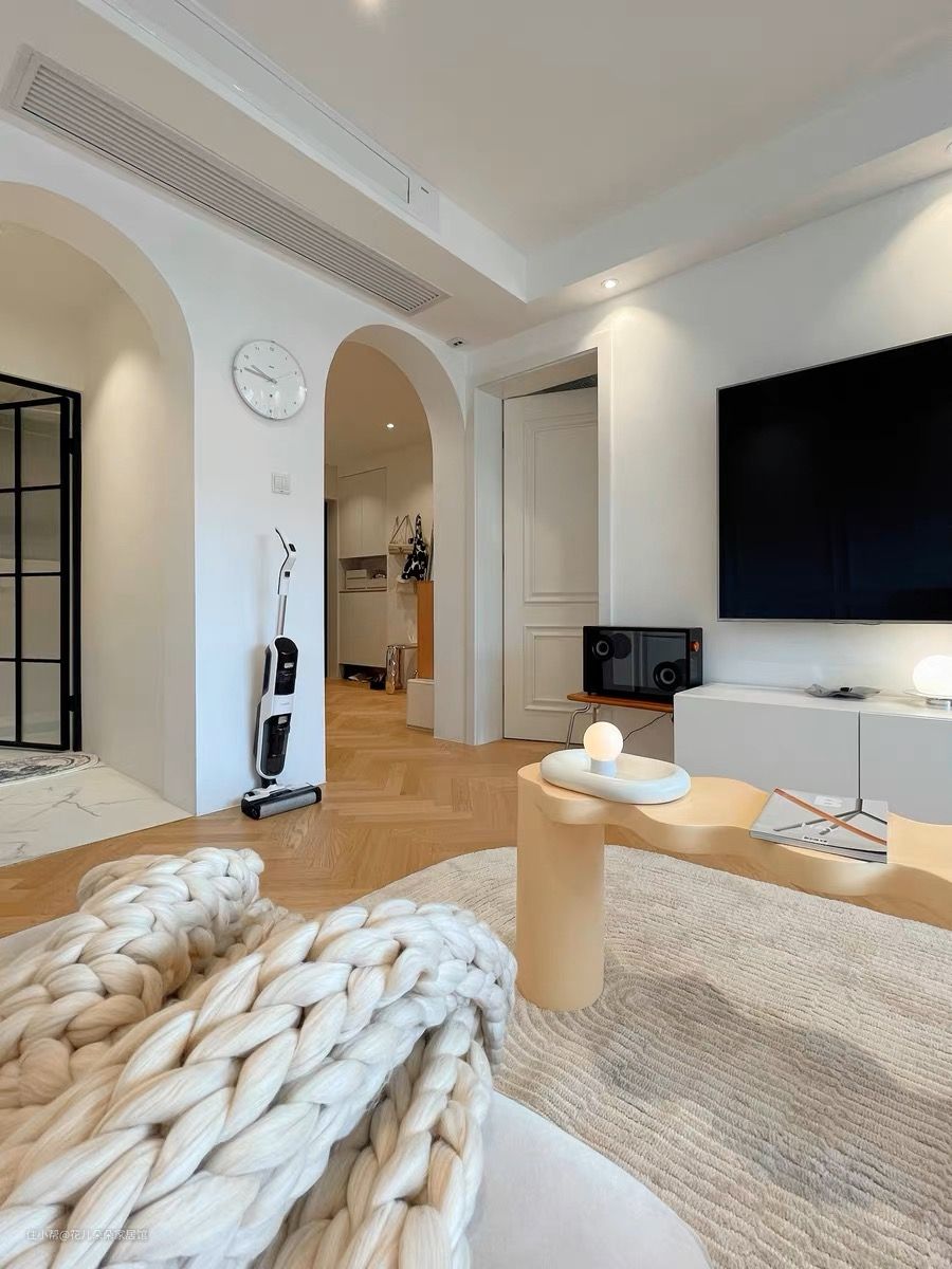 拱门设计+石膏线背景墙,打造高级又温馨的白色轻法式奶油客厅