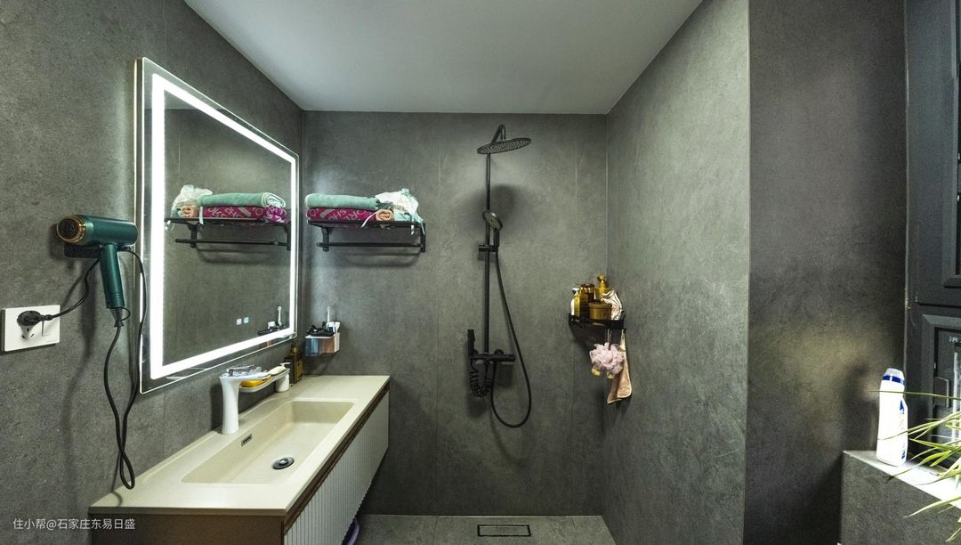 卫生间采用简约大气的灰色为主基调,给人一种简约低调又不失时尚的感觉。悬挂式的洗手台选用大理石台下盆设计,简约美观,台下盆的设计,打扫卫生时无卫生死角。