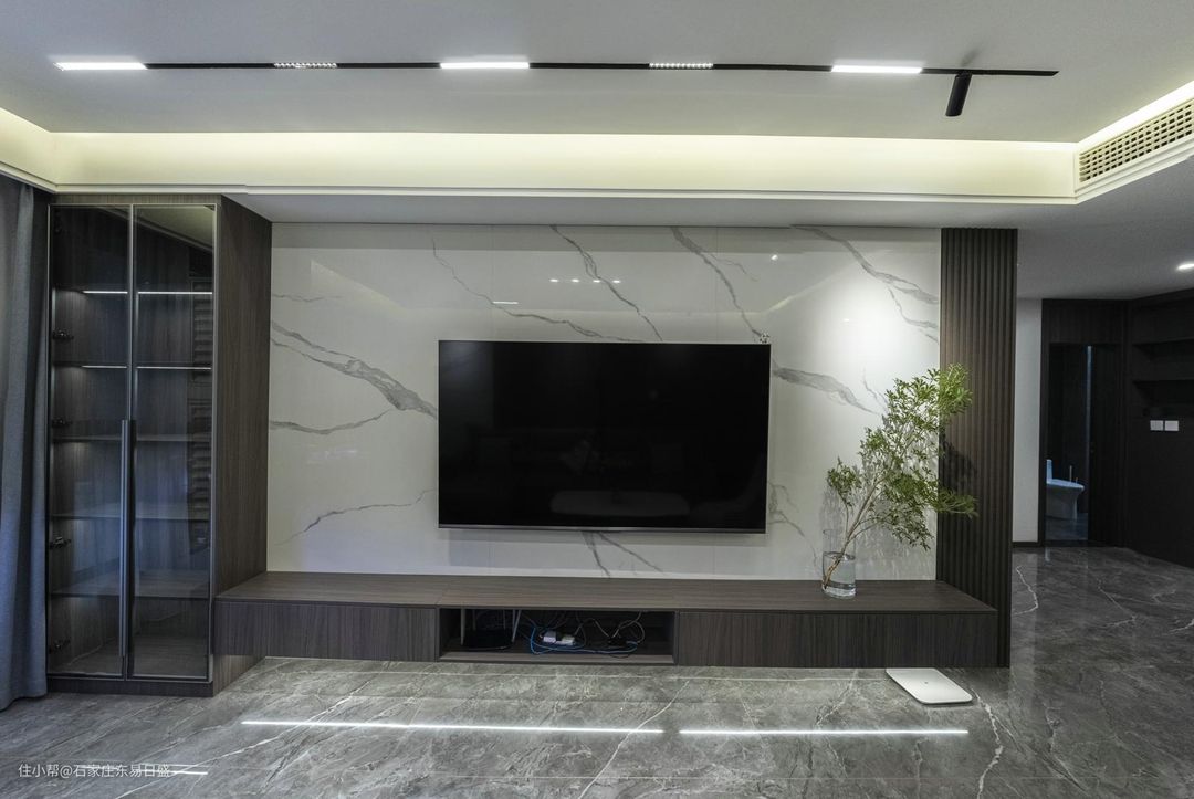 电视墙岩板加格栅的处理,让空间更加饱满,电视墙左侧做了一个通顶柜,可以放一些喜欢的艺术品。电视柜做的悬浮的设计,下面加了一个洗地灯,让空间更有层次感。沙发背景墙采用的护墙板+岩板的结合,与电视墙相呼应。