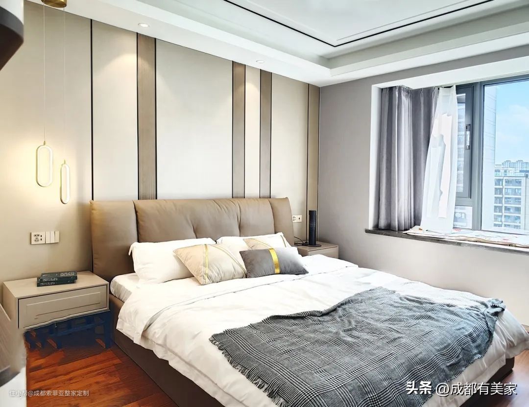主卧沿用主空间的配色为基调,深棕色护墙板点缀富有高级感。床头软包设计与阳光重叠,温柔也治愈。时光慢下来,细品恬静的每一个午后。