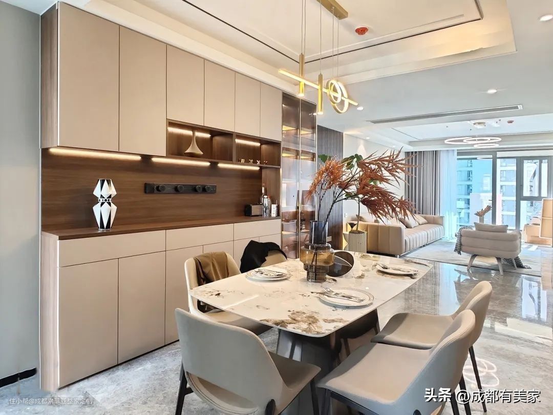 餐边柜的花色是尼克胡桃+臻灰,跟白色餐桌、灰色餐椅相呼应,简约而不单调,造型独特的餐灯打造温馨氛围。