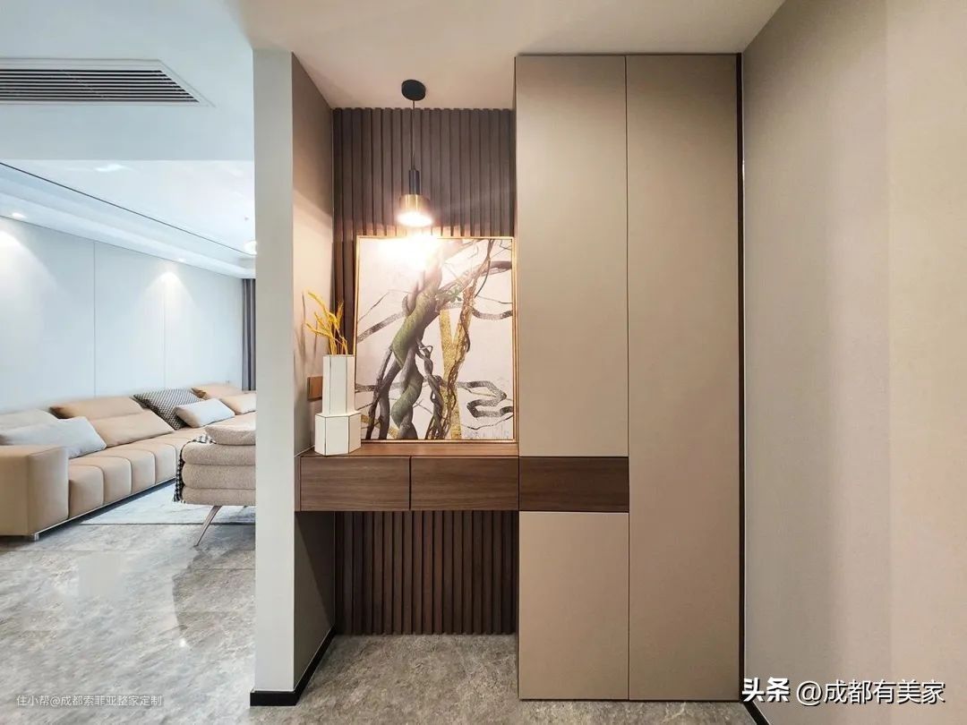 原木色+浅灰色玄关柜非常好看,柜子不用做太大,一个小台面和两面柜子就够用,台面上面摆放鲜花和艺术书,玄关端景便出现了。