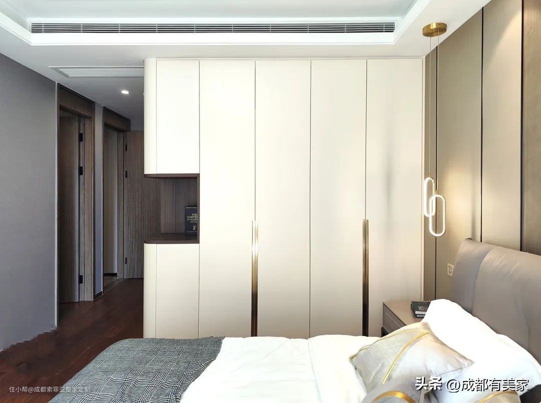 主卧衣柜花色是有尼克胡桃+果杏粉,一门到顶圆弧边衣柜,减少安全隐患,床头仅留一盏吊灯,柔光伴入眠。