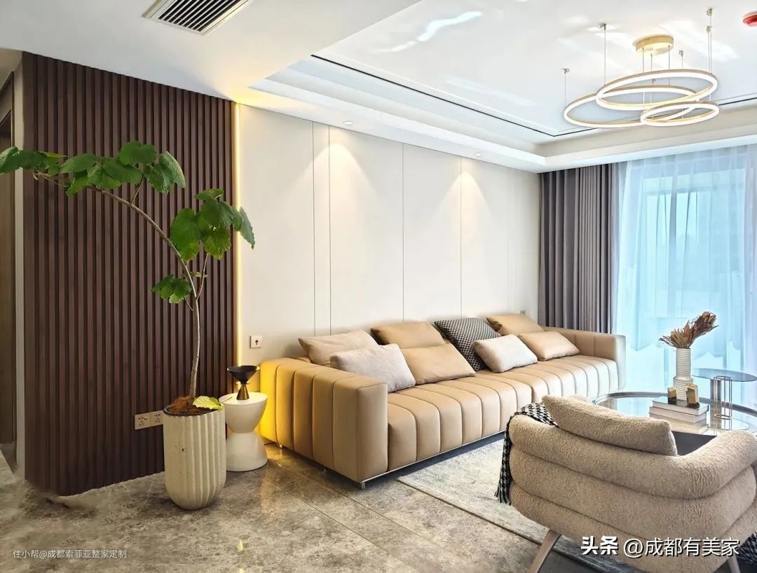超长浅咖色沙发,白色电视矮柜,深色格栅电视背景墙,圆形玻璃茶几,家具之间的搭配,让空间的质感超好~