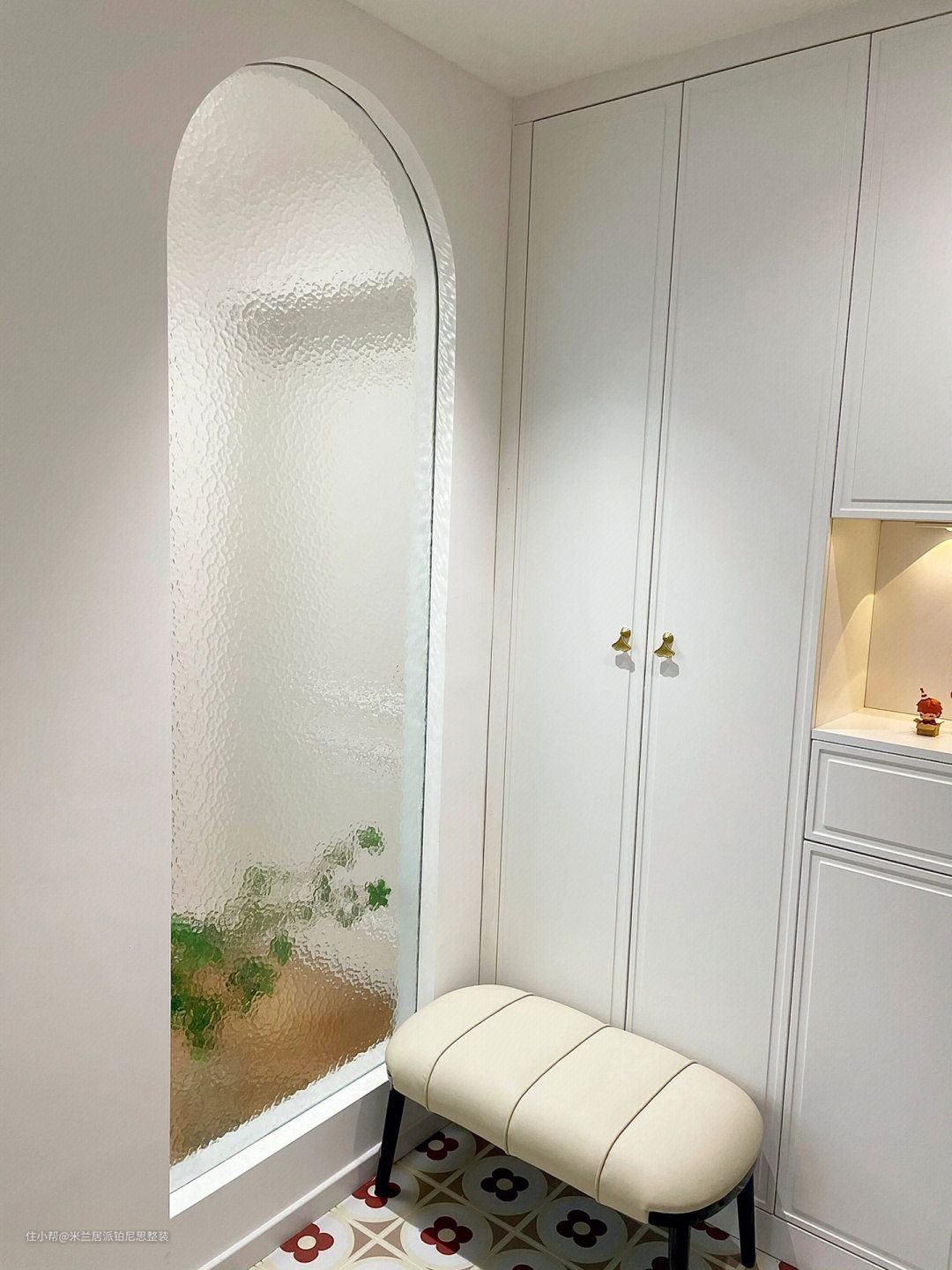 原始玄关进门正面和右面都是墙面,进门会有压抑感。我们把右面墙拆了做成一面鞋柜,美观的同时又增加了空间利用率。正面墙切割出一个法式拱门,再用水纹玻璃做隔断,既增加了透光度又增加了氛围感。