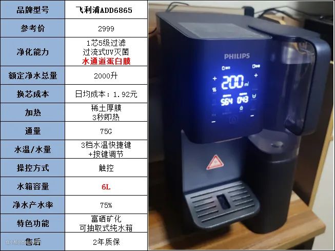 飞利浦ADD6865 是6860的升级款,主要是增加了过流式UV灭菌,滤芯同样采用的是水通道蛋白膜和5级过滤方案,额定净水量为2000升,净水产水率高达75%,在水效方面和很多超一级的厨下式净水机有得一拼。水箱是6L大容量原水箱,和2个1.5L的纯水箱,纯水箱采用可抽取方式,用水时更加方便。