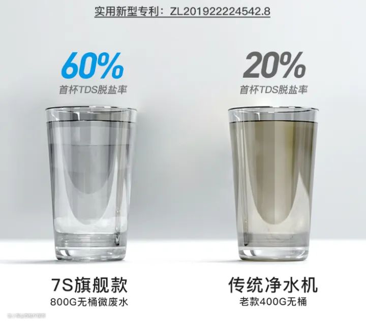 有些净水机的商品页可能不会直接给出净水产水率,我们可以通过净废水比来算出,比如净废水比为2:1代表产生2L净水,会排出1L废水,那么净水产水率=净水2L/(净水2L+废水1L)*100%=66.67%。