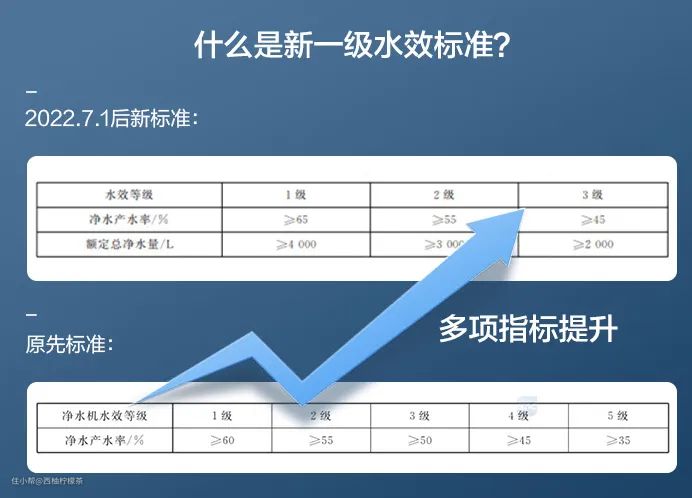 根据现在的新标准,净水机要达到一级水效,需要同时满足2个条件:净水产水率>65%、额定总净水量>4000L。