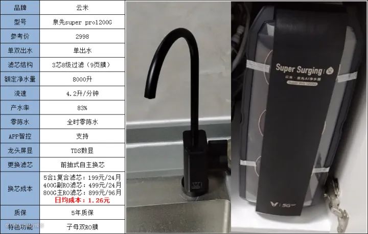 云米super pro1200G,这款净水机采用的是3芯8级过滤系统,由1套5合1复合滤芯和主副2套RO滤芯组成,流速可达4.2升/分钟,产水率高达83%,还支持全时零陈水,TDS数显龙头,可以说亮点还是挺多的。