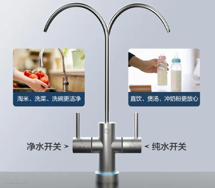 市面上的净水机通常有单出水和双出水两种,单出水只有一个水路,过滤出来的都是纯水;而双出水净水机将水路一分为二,净水是直接从前面的几级滤芯接出,没有通过RO反渗透膜过滤,平时可以用来淘米、洗菜、洗碗等,水量更大,更方便;纯水则是通过了反渗透膜过滤的,可以直饮、煲汤冲奶粉,水质更纯,更放心。