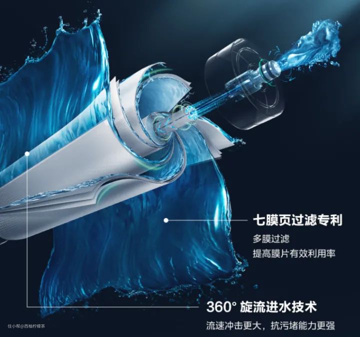 美的这款白泽1000G厨下式净水机,RO滤芯采用的是7页膜过滤专利技术,在360°旋流进水技术的加持下,比起传统的一端和两端进水,流速冲击力更大,抗污堵能力更强,宣传的5年更换一次RO膜,2年更换一次PCB复合滤芯的底气就来自这里。