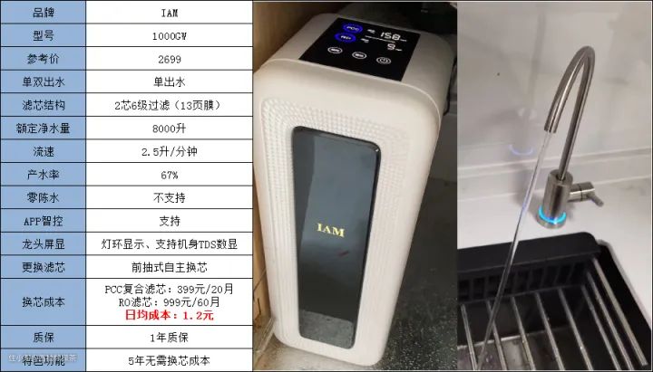 IAM 这款1000GW是新推出的一款1000加仑的大流量RO反渗透净水机,采用2芯6级过滤,13页膜,出水速度可达2.5升/分钟,3.6秒就能接满一杯水,非常高效,而且滤芯的额定净水量高达8000升,基本可以满足5年的用水量,长效耐用,节省后期使用成本。