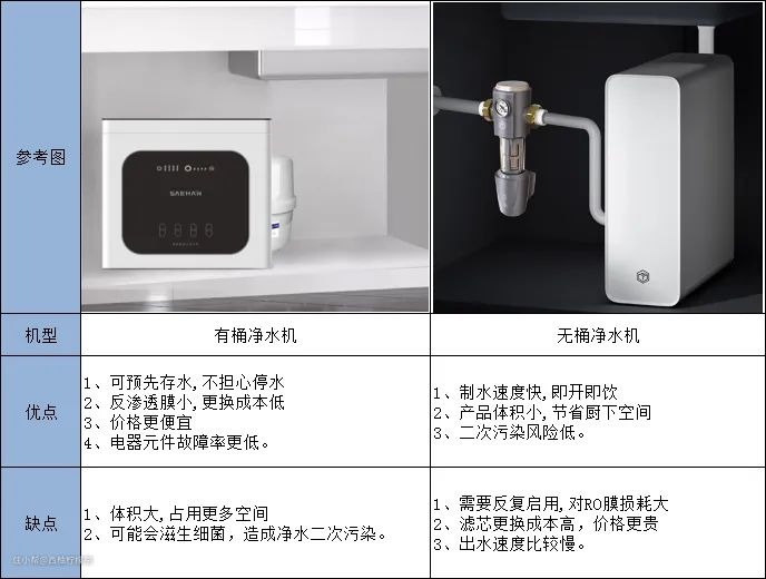 无桶净水机:顾名思义不需要储水桶蓄水,用水时及时制水,对反渗透膜通量的要求比较高,哪怕是600G的无桶净水机,出水速度也比不上50G的有桶净水机的出水量。而且打开水龙头就要开始工作,使用频率高,电器元件老化会比有桶机快。