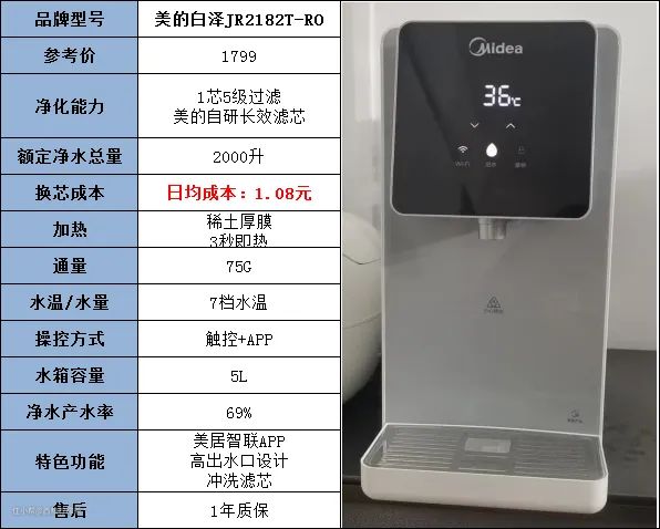 美的这款 JR2182T-RO台式净热一体机属于白泽系列,采用了升级之后的厚膜加热技术,功率高达2000W,在螺旋式加热技术的加持下,可以满足18升/小时快速制热的需求。
