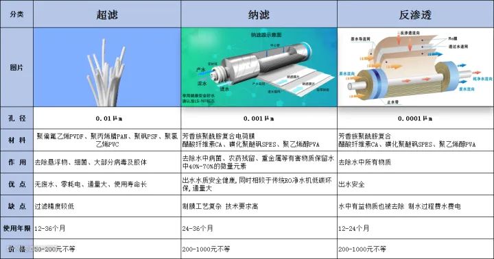 超滤:价格便宜,零耗电,通量大,使用寿命长等优点,但由于孔径精度低,可以过滤掉水中体积较大的悬浮物、大部分的细菌、病毒和胶体,但对于重金属、农残等有害物质和大量的微量元素都无法过滤,适合在一些水质比较软的地区使用。