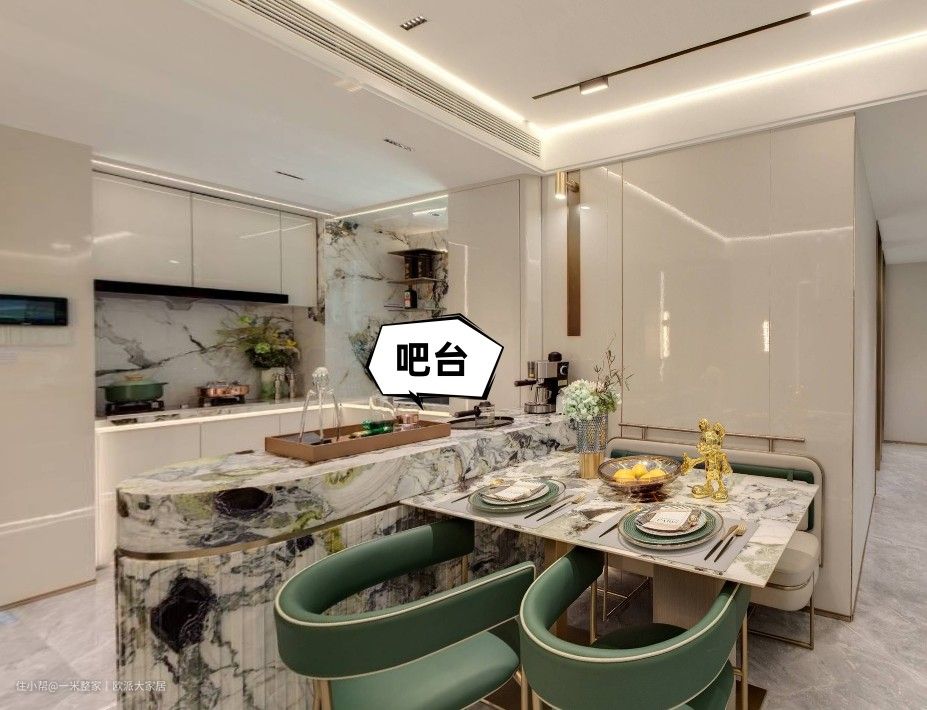 如果有业主不喜欢把餐桌嵌入餐边柜里,可以用同样具备收纳功能的吧台代替餐边柜。