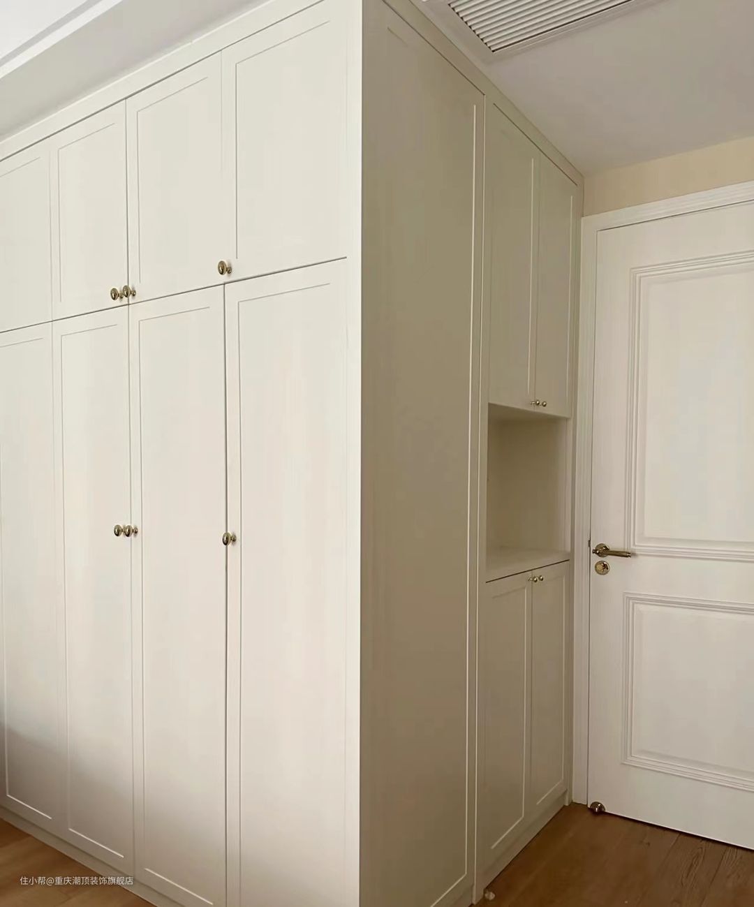 入口延伸出一字型玄关,柜体采用奶油系米白色,搭配嵌入式灯带,极大地提升了空间的体验感。中间镂空设计40cm,收纳包包帽子和外套之类的,定制收纳,白色的柜门同时又与整体暖系风格保持一致。#玄关