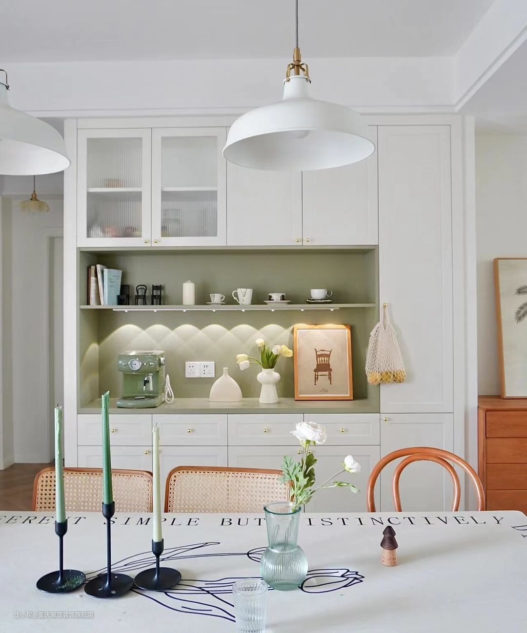 整体配色奶油米白色搭配清新牛油果绿和原木综,三个颜色交替空间层次感分明,这大概是春天住进家里的感觉了吧