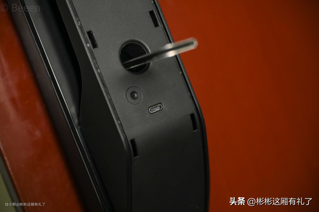 如果人在外面电池没电了怎么办?这里有两种解决办法,都是先打开门外面的隐藏面板,一种是用备用钥匙打开。另外一种,就是在门外给电池充电,也是Type-C口充电线就行。其实在云米APP上也能看到门锁的电池电量,电量低的时候我们提前点把电充上就好了。