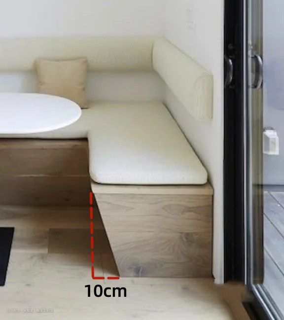 靠墙的餐椅是卡座式的,卡座底部的收纳柜预留了约40cm的高度。