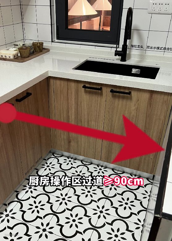 厨房操作区的过道≥ 90 cm,这样才能操作方便。