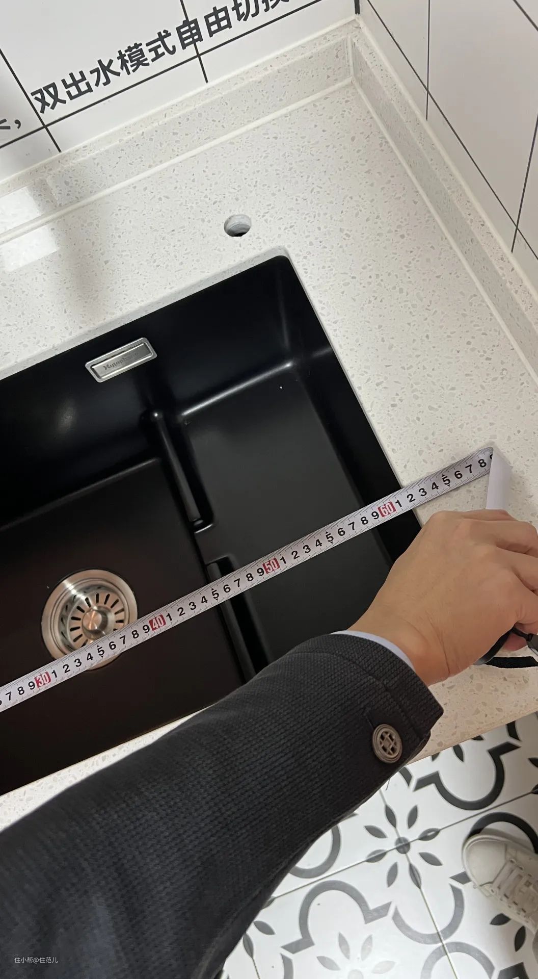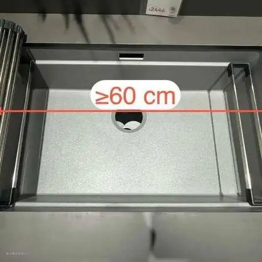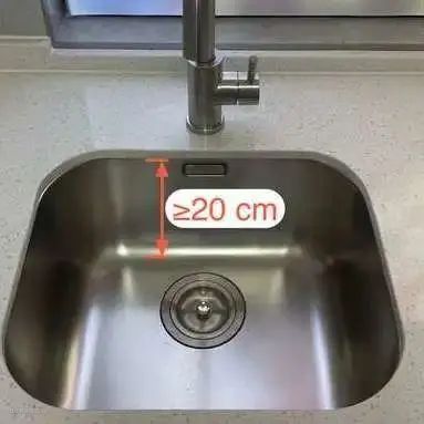 水槽长度≥ 55 cm,洗手盆有条件的话,做成 70 cm的大单槽,这样用起来更方便。洗手盆的高度≥ 20 cm,不溅水都能放