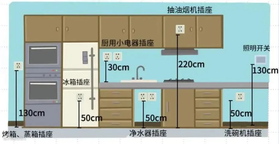 说的粗俗点,插座尽量能多不少。具体的预留位置和数量要根据自己电器与橱柜的摆放位置决定。