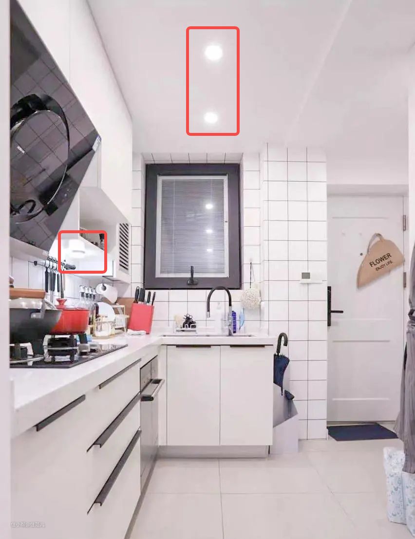 吊柜底部内嵌条形灯带作为补充照明,假如忘记提前预留电线,后期也可以买橱柜灯带,最好是感应式的,下厨时就算手上有油污也能一扫就亮。