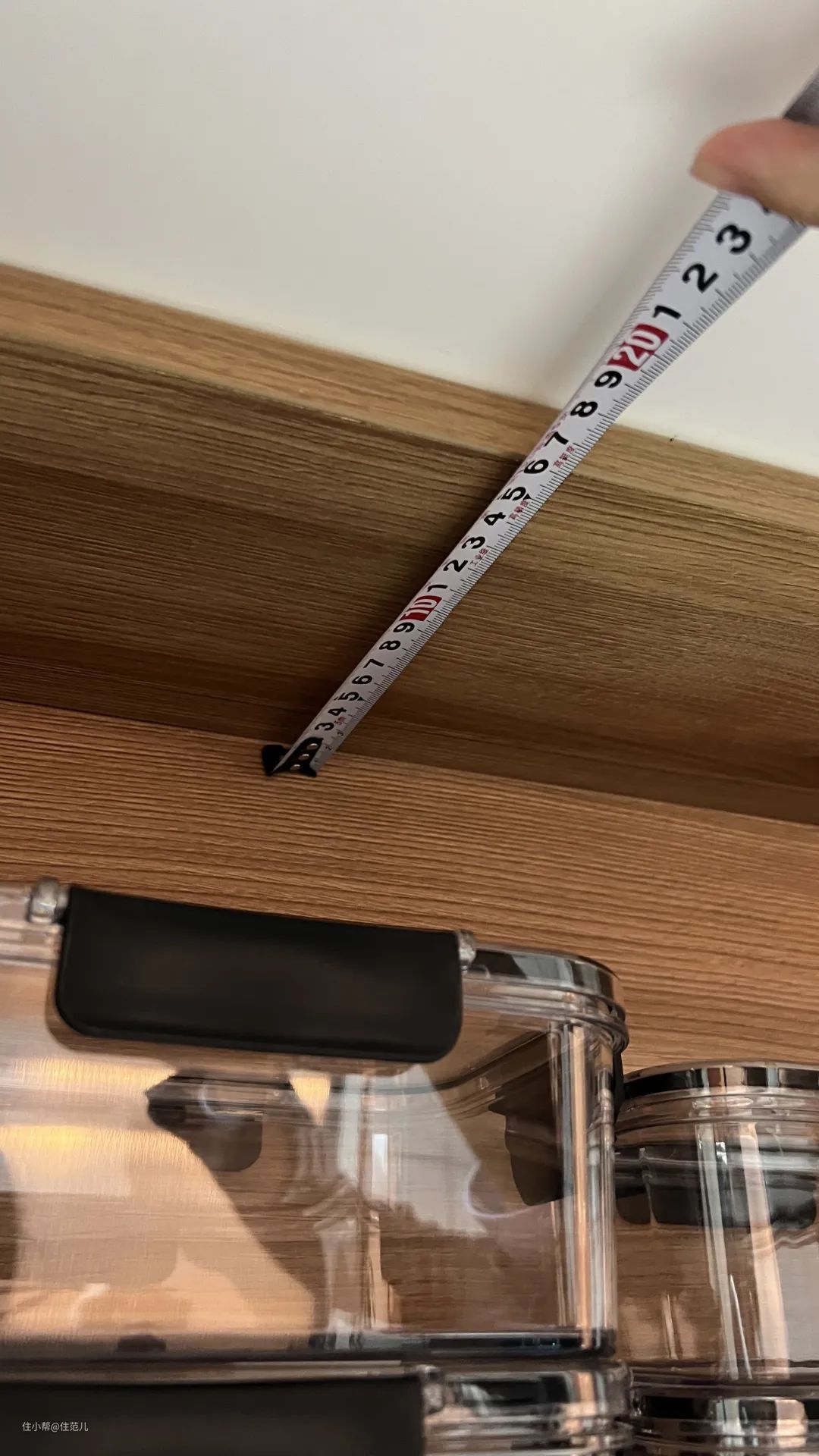 将整体吊柜移到顶,在吊柜底部加一层开放格。不仅极致利用了纵向空间,也避免了吊柜上方落灰。