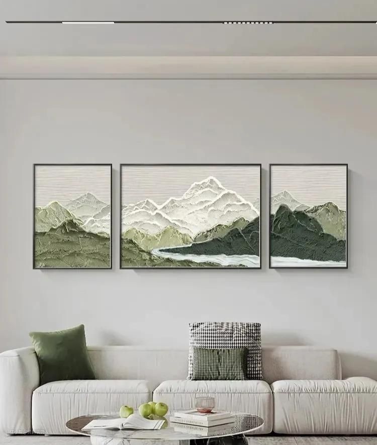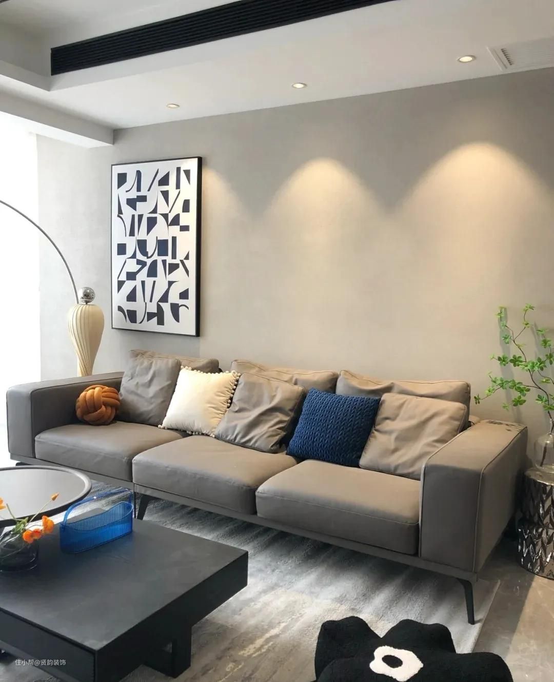 比如像这种几连画,就可以用这种选挂画尺寸的方法,居中摆放以撑满整个沙发为原则,营造饱满的感觉,包括单幅横向挂画也是这样的原则。