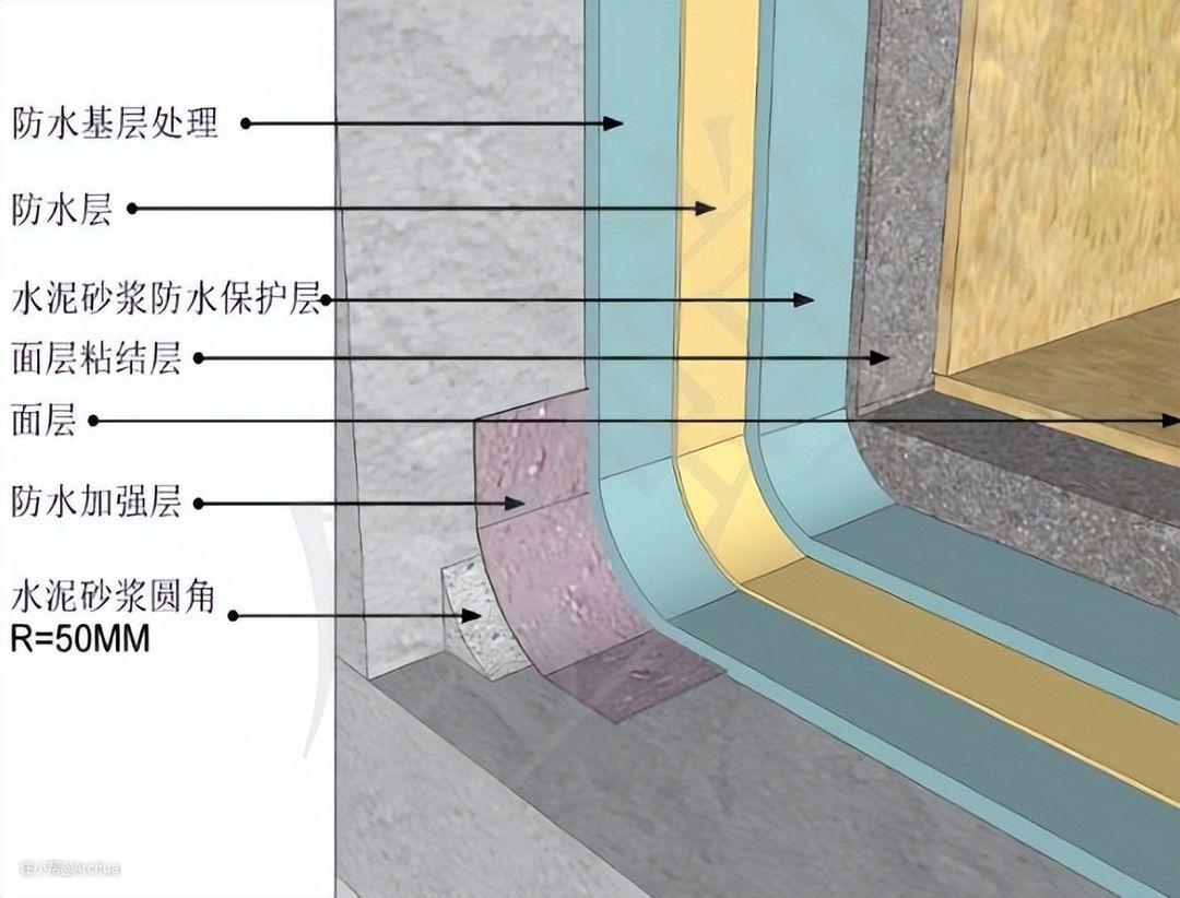 无障碍卫生间和常规卫生间一样,除了安全、方便的功能设计外,最重要的是施工过程中的防水处理。 01 基层处理 基层应平整、坚实、干净、无浮灰和油污,阴阳角应进行加强处理,对基层有裂缝以及管根留设的凹槽,应进行填充;基层需润湿,但不得有明水。 在地面做防水之前,需将地面进行细部找平,顺地漏方向找坡处理;对于基层裂缝(非结构层),应根据裂缝的大小采取不同的处理措施。 02 转角部位处理 转角部位还应做成圆弧,阴角半径宜大于50mm,阳角半径宜大于10mm,以使墙面与地面防水更好的形成一体,防止墙角渗水。