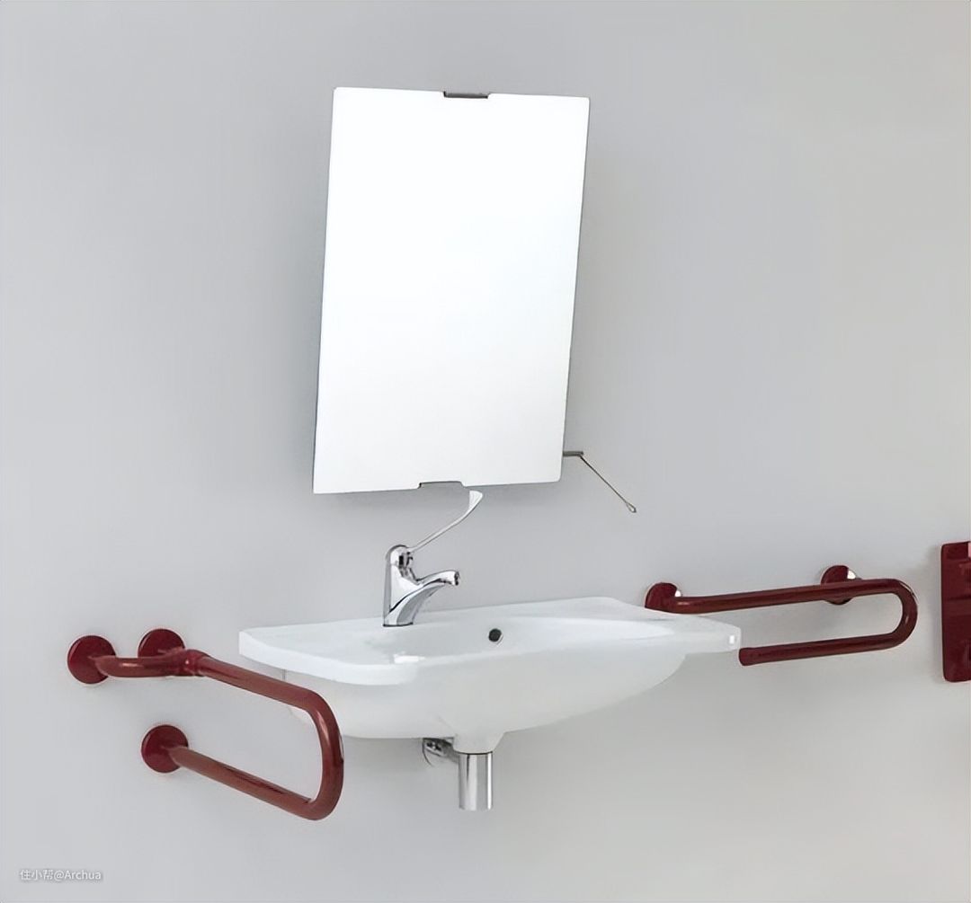 还需要在洗手盆上方安装镜子,出水龙头的出水方式应该采用杠杆式水龙头或感应式自动出水。