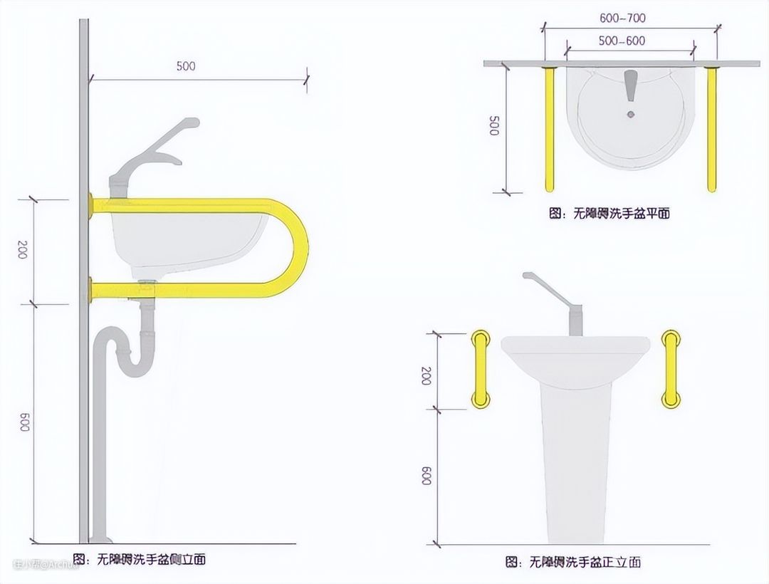 (2)无障碍洗手盆 无障碍洗手盆的水嘴中心距离侧墙应该大于550mm,底部需预留出宽750mm、高650mm、深450mm的空间,方便供乘轮椅者的膝部和足尖部的移动。