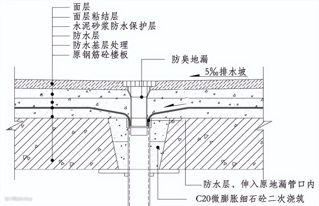 原地漏上口必须与原结构楼板平齐,不能高于结构楼板层表面;卫生间防水层须伸入原地漏内侧30mm。