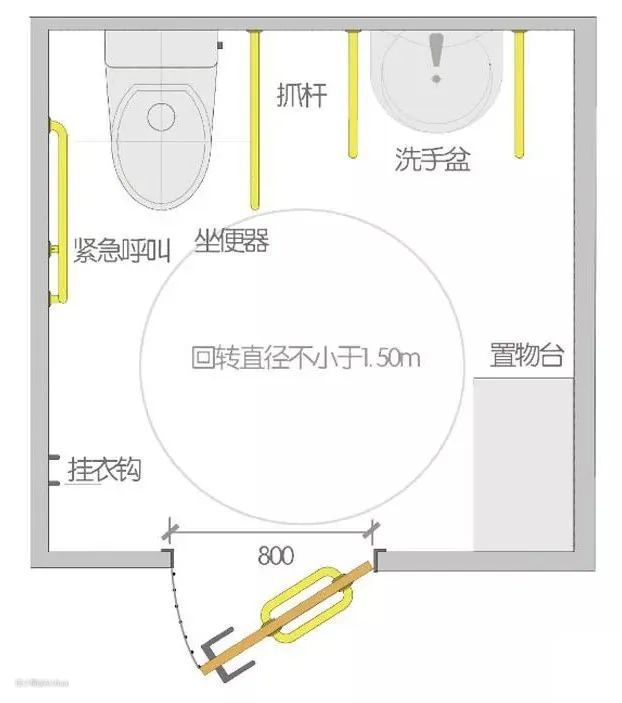 为方便乘轮椅者进入和进行回转,厕所的入口和通道回转直径不小于1.5m;门应方便开启,通行净宽度不应小于800mm。